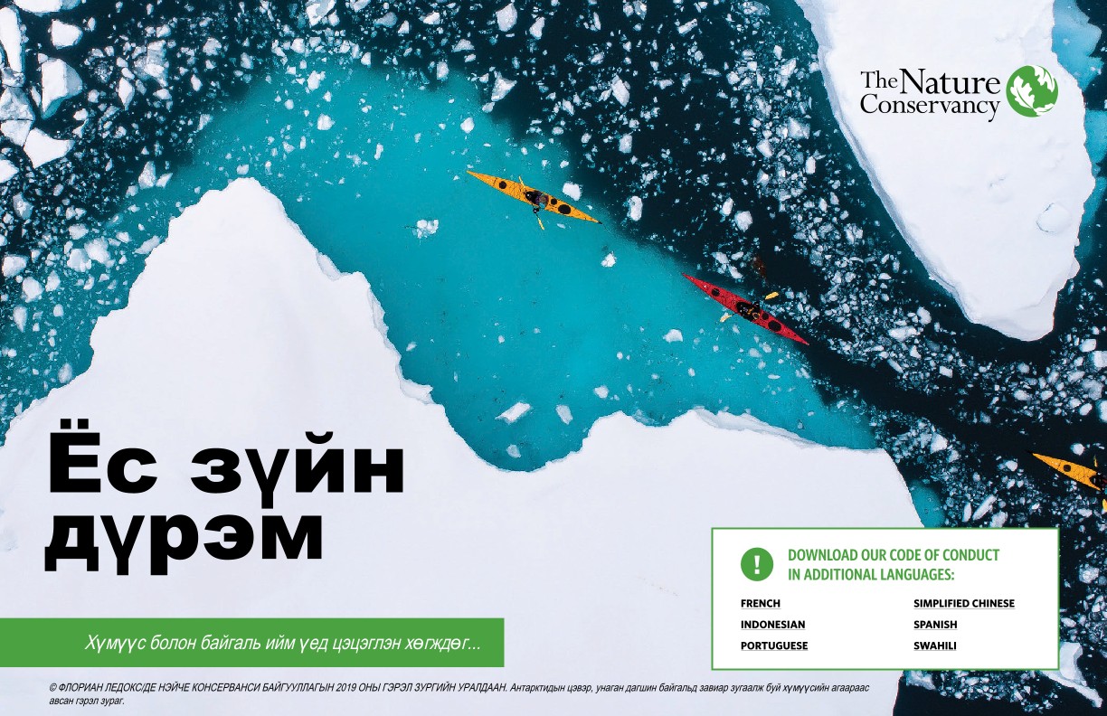 Дэ Нэйче Консерванси (TNC) байгууллагын ёс зүйн дүрмийг ажилтнууд, удирдах зөвлөлийн гишүүд, итгэмжлэгдсэн төлөөлөгч/зөвлөх, сайн дурын ажилтнууд болон байгууллагад үйлчилгээ үзүүлэгч гуравдагч этгээдүүд TNC-д ажил үүргээ гүйцэтгэхдээ дагаж мөрддөг. Мөн байгууллагын ажилтнууд болон бидний нэрийн өмнөөс үйл ажиллагаа эрхэлж буй гуравдагч этгээд нь тухайн улс, муж, орон нутаг бүрийн холбогдох хууль тогтоомж, дүрэм, журмыг дагаж мөрдөх ёстой.